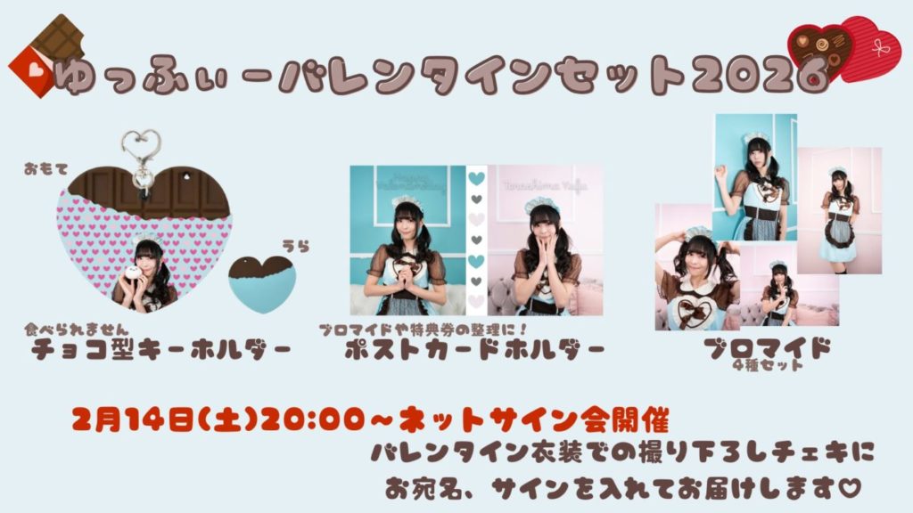 2/14(木)20:00〜youtubeにて配信予定のネットサイン会では、【今回の衣装で撮り下ろしたチェキ】に、ゆっふぃーが生配信しながら【ご希望のお宛名】と【直筆サイン】を入れてお届け!